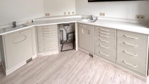 Nachher: Der Schrank erscheint viel frischer und leichter in einem modernen Sand-Ton. Der Behandlungsraum wirkt freundlicher und die Patienten erfahren ein stilvolles Update.